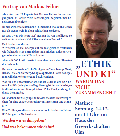 Er sagt: „Was wir heute „KI“ nennen ist von Intelligenz so weit entfernt wie ein VW Käfer von einem Ferrari.“ Und das ist das Muster: Wir werfen so viel Energie auf die fast gleichen Verfahren wie früher, da ist es normal dass man mit dem Italosportwagen schneller an der KITA ankommt. Aber mit 300 km/h zerstört man eben auch den Planeten deutlich mehr. Der amerikanischen Tech-“Broligarchie“ um Trump, Musk, Bezos, Thiel, Zuckerberg, Google, Apple, und Co ist das egal, man will den Weltuntergang beschleunigen. Was für uns unvorstellbar scheint, ist leider in den USA bereits Realität: Jede globale regulierung ist der Antichrist, so Multimillardär und Trumpflüsterer Peter Thiel, und es gelte die zu bekämpfen. KI ist dabei der Steigbügelhalter, das Messias-Heilsversprechen für eine ganze Generation von Investoren und Managern. Eine Trillion, so Altman brauche er noch, das ist das Jahres BSP der ganzen Weltwirtschaft.